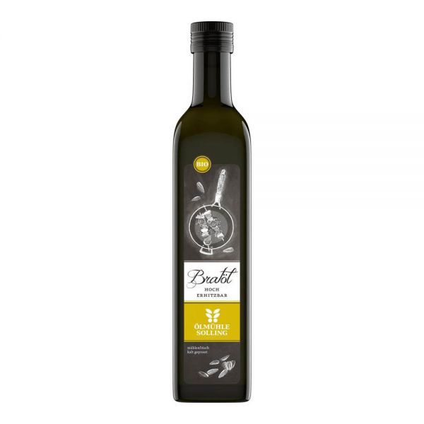 Das Bratöl der Ölmühle Solling wird aus geschälten High Oleic Sonnenblumenkernen aus kontrolliert biologischem Anbau mühlenfrisch kaltgepresst und ist aufgrund seines hohen Ölsäuregehaltes von zirka 80 g pro 100 g besonders hitzestabil. Es eignet sich zum Dünsten, Braten, Backen und Frittieren. Unser Bratöl ist vegan, laktose- und glutenfrei. Es sollte bei Zimmertemperatur und stets gut verschlossen aufbewahrt werden. Die Ausgießhilfe auf den Flaschen erleichtert ein genaues Dosieren und verringert zugleich den Kontakt des Öls mit Sauerstoff beim täglichen Gebrauch.